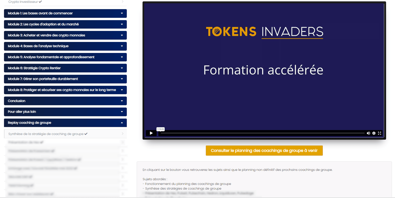 Une fois inscrit, vous recevez par email un accès au site internet réservé aux membres. Vous y verrez les vidéos organisées par module, traitant une à une de ce que vous devez savoir pour créer un bon portefeuille crypto monnaie. Un peu de théorie, beaucoup de pratique pour vous permettre d’implémenter directement ce que vous apprenez.
